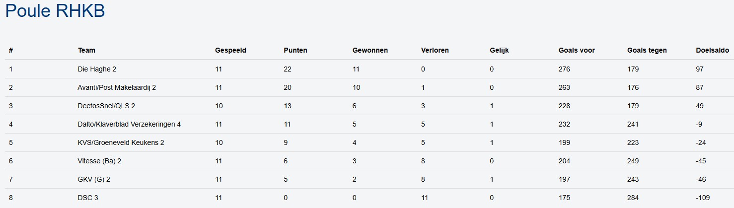 Die Haghe 2 won ook zeer eenvoudig en blijft daarmee de kop van de ranglijst aanvoeren. De volgende wedstrijd van het tweede is op zaterdag 28 februari in Dordrecht waar de lastige uitwedstrijd tegen DeetosSnel/QLS 2 wacht. Wil het tweede nog meedoen om het kampioenschap dan zal als eerste deze wedstrijd gewonnen moeten worden.