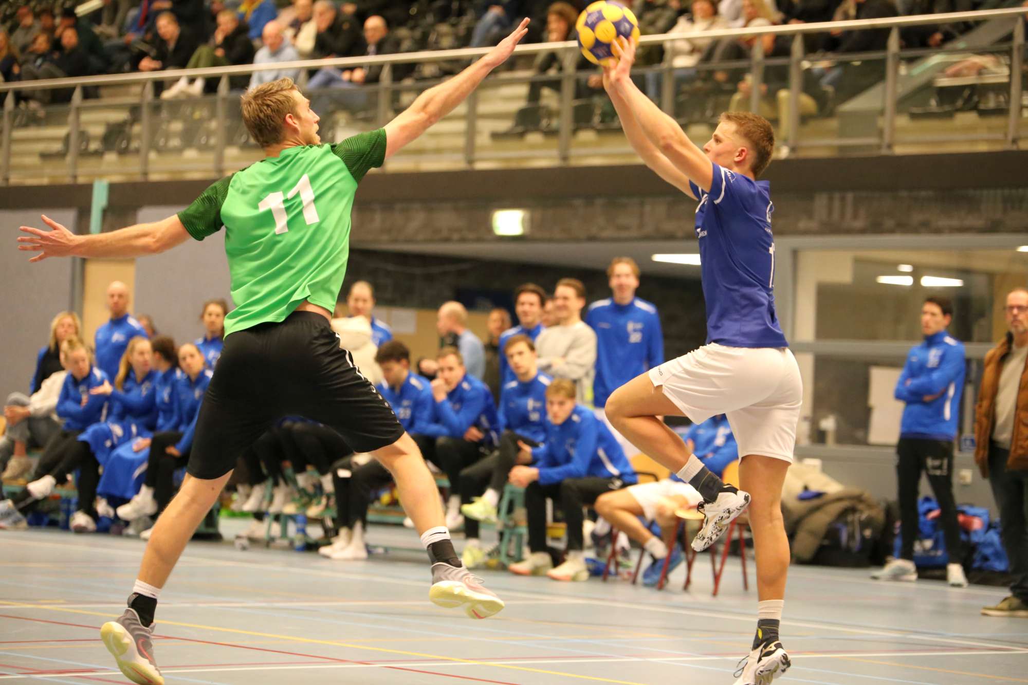 Over de eerste de eerste helft kunnen we kort zijn. KVA loopt uit naar een 2-9 voorsprong na 12 minuten spelen. Mede door twee gemiste stippen van de thuisploeg en een volledig schotloze eerste aanval. Alleen Floor van afstand en Maddy ( zie hierboven ) met een fraaie onehander doorloop. Pas na 15 minuten de eerste treffer van het eerste aanvalsvak van Merijn. De rust wordt bereikt met maar liefst een 6-17 achterstand.