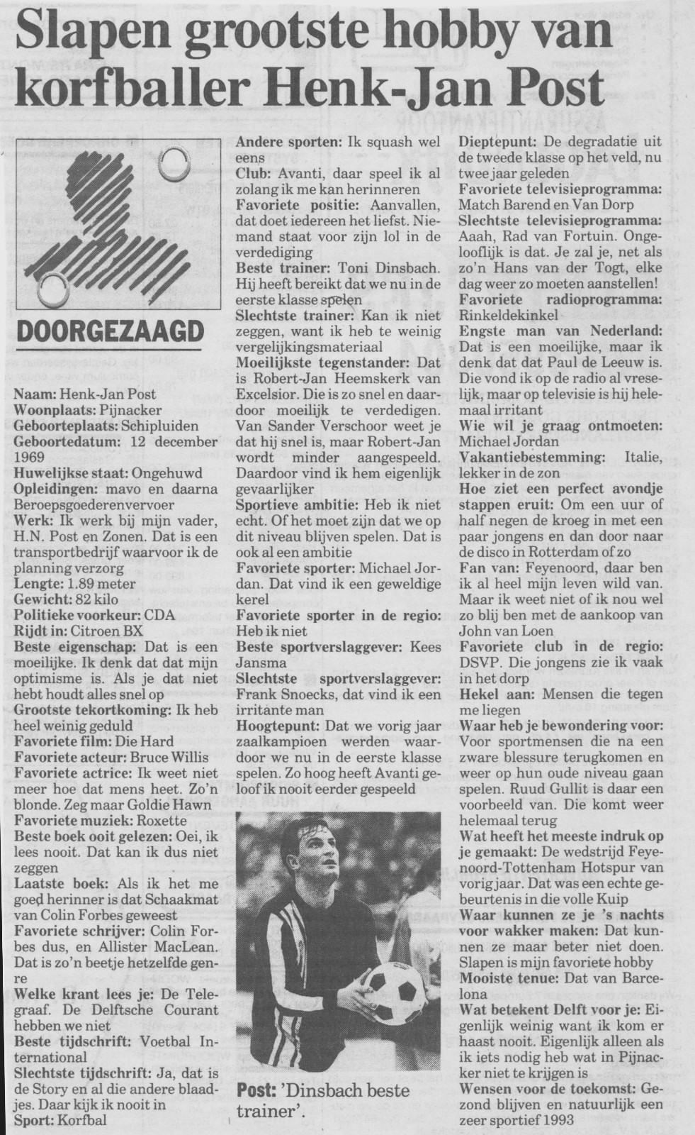 Maar het thema van deze aflevering is interviews voor de krant. Zoals bekend moet je altijd op je hoede zijn met uitspraken tegen journalisten. Zij azen op smeuïge teksten en koppen boven het artikel om zoveel mogelijk lezers te trekken. We plaatsen hier twee interviews uit dat seizoen 1992/1993. En bij beide artikelen heeft de journalist een aandacht trekkende kop boven het artikel gezet. De eerste is met Henk Jan Post, destijds één van de jonge talenten die ondanks zijn jonge leeftijd al een belangrijke speler was in de hoofdmacht. Bijzonder om te zien hoeveel er in ruim 30 jaar kan veranderen.