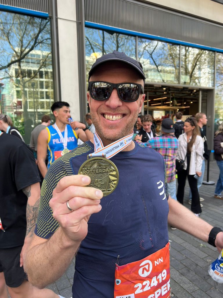 Jasper Vedder is er niet alleen als de kippen bij om een speler in de selectie te verzorgen. Zet hem aan de start van een marathon en na 3.:37:40 uur is hij alweer terug. Dan mag je blij zijn met een medaille als deze.